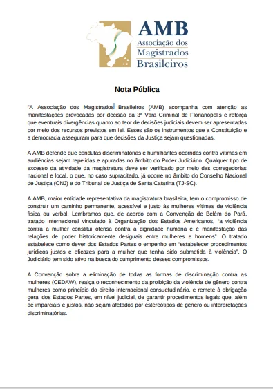 A Associação dos Magistrados Brasileiros (AMB) se manifestou defendendo a importância da implementação da Política Nacional de Incentivo da Participação Feminina no Poder Judiciário após a grande repercussão do comportamento do juiz Rudson Marcos, do Tribunal de Santa Catarina, no julgamento de André de Camargo Aranha, acusado de estuprar a influencer Mariana Ferrer.