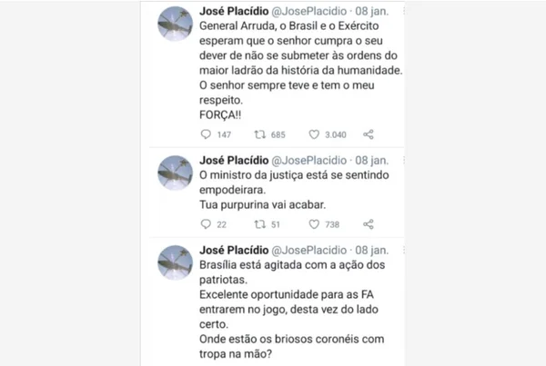 José Placídio Matias dos Santos, coronel que ocupou cargo de confiança no Gabinete de Segurança Institucional (GSI) por três anos durante a gestão do general Augusto Heleno, pediu diretamente que o general Júlio César de Arruda, comandante do Exército, se coloque à frente de um golpe de Estado.