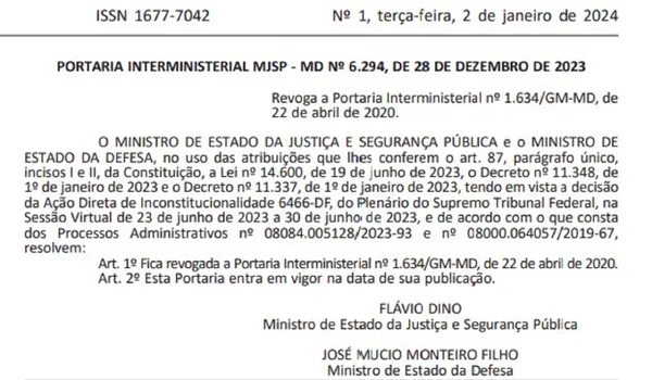 A decisão do atual governo foi assinada dia 28 de dezembro e publicada no Diário Oficial da União (DOU) desta terça. A portaria do governo do ex-presidente Jair Bolsonaro (PL) faz parte do pacote de medidas que ampliou o acesso a armas e munição.