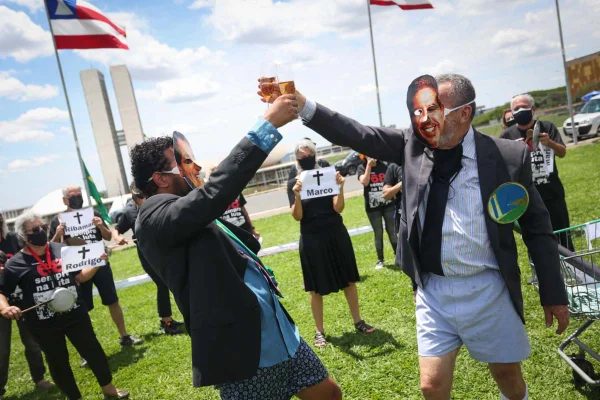 Na interpretação, o presidente da Câmara entra em cena, carregando Bolsonaro em um carrinho. Os dois dançam, esbanjam dinheiro, tomam champanhe, diante de protestos do povo. Vestidos de preto, integrantes do grupo portavam cartazes com o nome de vítimas da Covid-19 e ironizaram as falas do presidente, minimizando as mortes e a gravidade da pandemia.