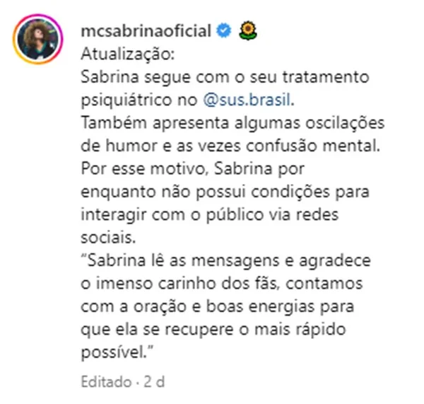 “Sabrina segue com o seu tratamento psiquiátrico no SUS Brasil. Também apresenta algumas oscilações de humor e as vezes confusão mental. Por esse motivo, Sabrina por enquanto não possui condições para interagir com o público via redes sociais”, diz a nota.