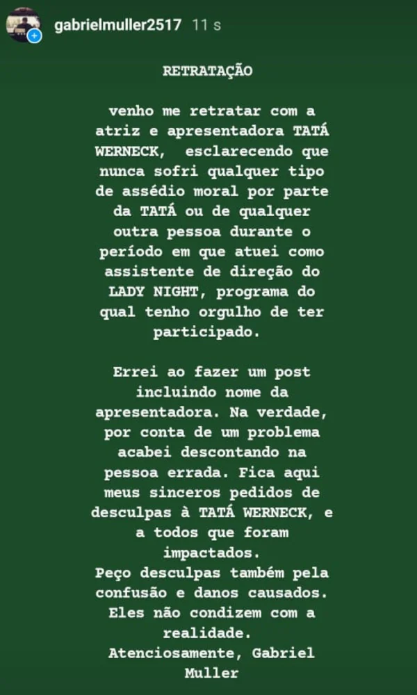 “Venho me retratar com a atriz e apresentadora Tatá Werneck, esclarecendo que nunca sofri qualquer tipo de assédio moral por parte da Tatá ou de qualquer outra pessoa durante o período em que atuei como assistente de direção do Lady Night, programa do qual tenho orgulho de ter participado”, declarou.