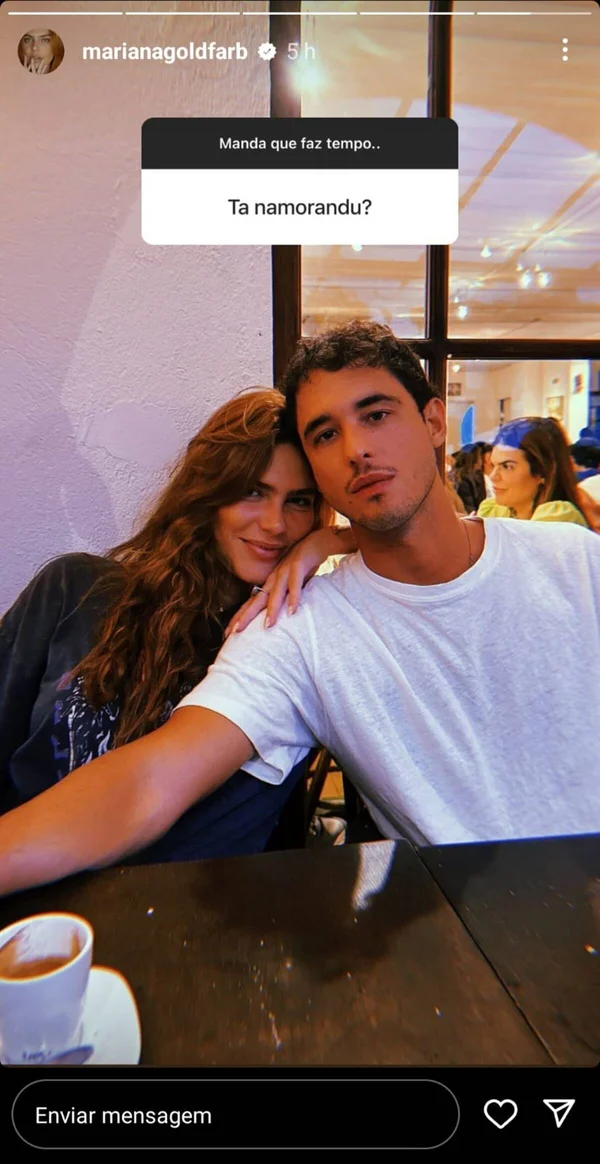 Nos stories, ela foi questionada por um fã se estava namorando. Sem dar qualquer informações complementares, Mariana Goldfarb postou uma foto ao lado de um rapaz.
