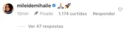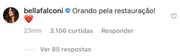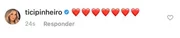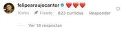 Tici e Felipe deixaram diversos emojis de coração. Lucas Guimarães, marido de Carlinhos Maia, comentou: “Que todo mal caia por terra e que sejam muito felizes”. Já a musa fitness Bella escreveu: “Orando pela restauração”. A ex-BBB e cantora Gabi Martins também prestou seu apoio ao casal. Mileide Mihaile, ex-esposa de Wesley Safadão, foi outra que comemorou a notícia.