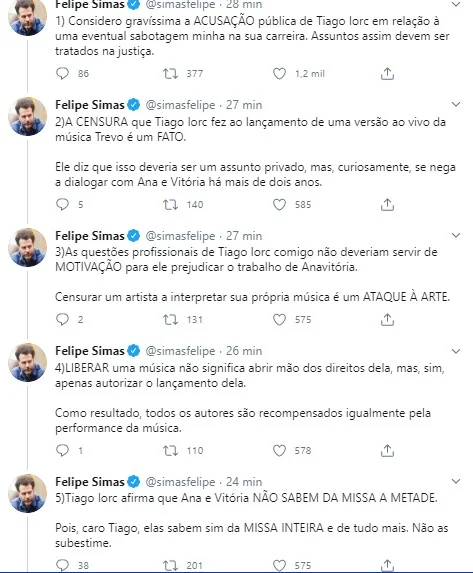 Em uma série de publicações em seu perfil do Twitter nesse sábado (13/06), Felipe afirmou que a “censura que Tiago Iorc fez ao lançamento de uma versão ao vivo da música Trevo é um fato”.