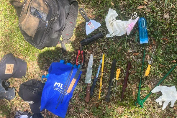 Com ele, os policiais ainda encontraram uma mochila com diversos objetos dentro, como facas, abraçadeiras, alicate, lanterna, serras, um frasco de lubrificante íntimo, além de uma mecha de cabelo.