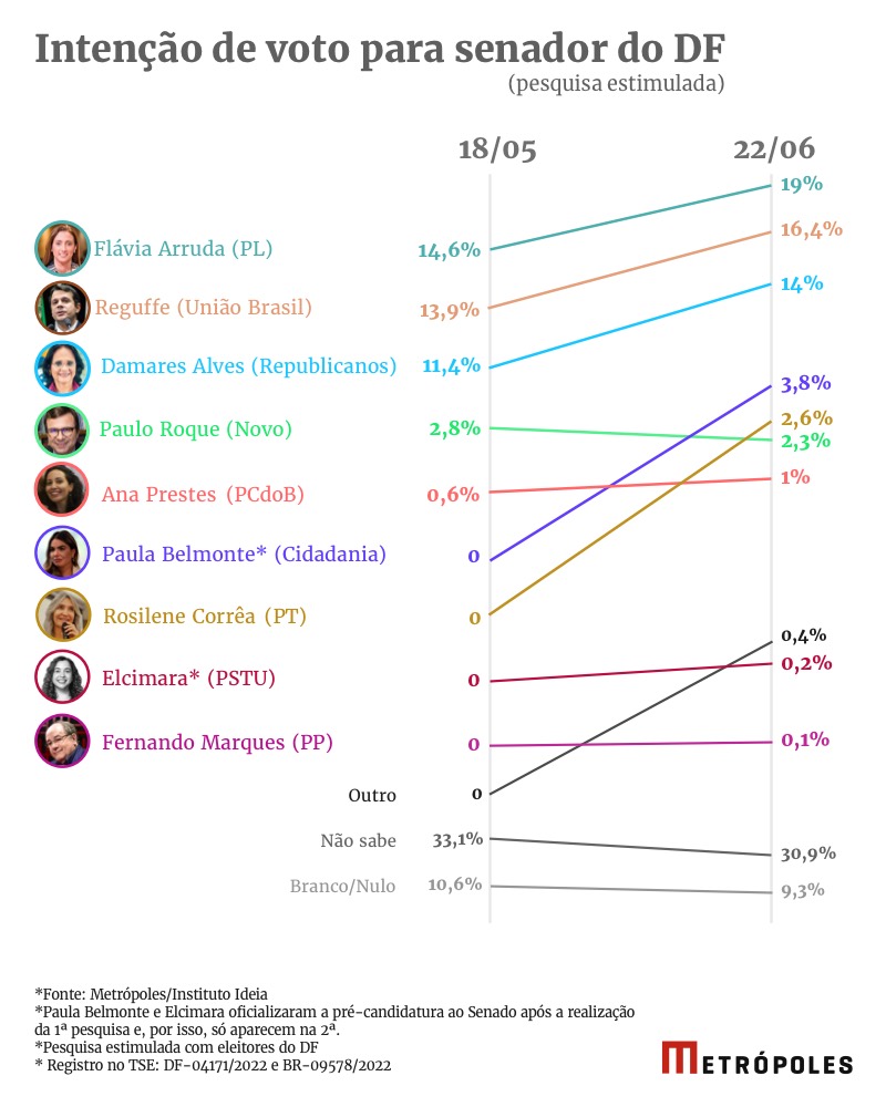 A pesquisa mostra que a deputada federal Flávia Arruda (PL) tem 19% das intenções de voto. O senador José Antônio Reguffe (União Brasil) foi lembrado por 16,4% dos eleitores, seguido da ex-ministra Damares Alves (Republicanos), indicada por 14%.