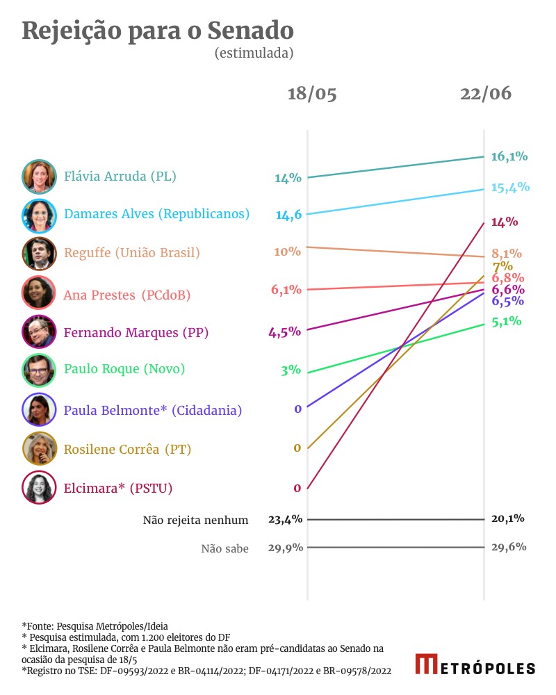 Ao serem questionados sobre a rejeição, na pesquisa estimulada, os eleitores do DF disseram em quem não votariam. Flávia Arruda tem a maior rejeição (16,1%); seguida por Damares (15,4%), Elcimara (14%), Reguffe (8,1%), Rosilene Corrêa (7%), Ana Prestes (6,8%), Fernando Marques (6,6%), Paula Belmonte (6,5%) e Paulo Roque (5,1%).
