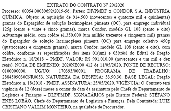 A PMDF já tinha feito uma primeira compra em dezembro de 2019, de 1,275 tonelada de gás por cerca de R$ 511,5 mil. O registro de preço com a empresa Condor, fornecedora tradicional de munições letais e não letais, foi feito com volume ainda maior, totalizando mais de 8 toneladas.