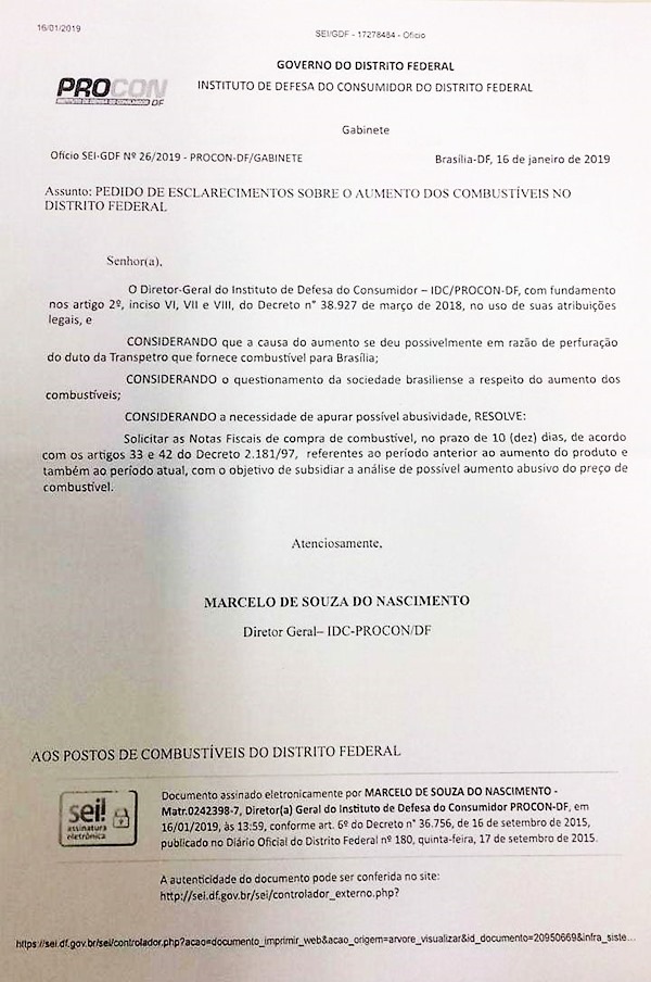 O Instituto de Defesa do Consumidor (Procon) do Distrito Federal notificou 30 postos de combustíveis, nessa quarta-feira (16/1), pela prática de preços abusivos. Cada estabelecimento, escolhido por amostragem, terá de apresentar as explicações em até 10 dias, prazo que termina em 26 de janeiro. Os donos terão de apresentar as notas com preços de compra e venda da gasolina dois dias antes do aumento e dois dias depois.