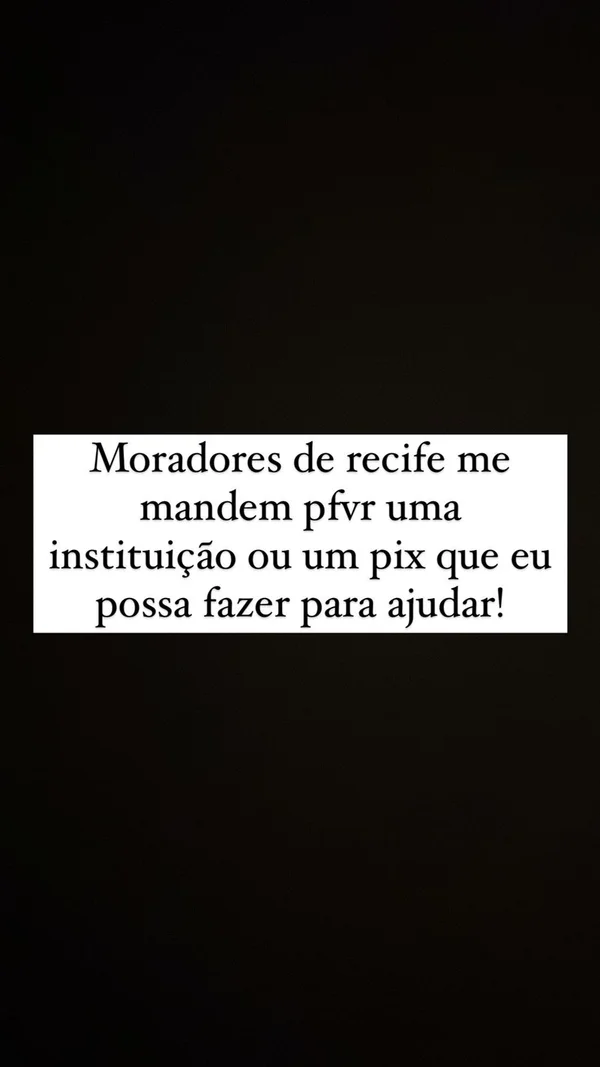 Gkay também mostrou sua preocupação com as pessoas que moram na Região Metropolitana do Recife e pediu que todos ajudem. “Por favor, vamos ajudar Recife. Seja de qualquer forma, pode ser compartilhando uma imagem. Você não tem noção do quanto você ajuda, porque você vai reverberando esse assunto e mais pessoas vão sabendo.”
